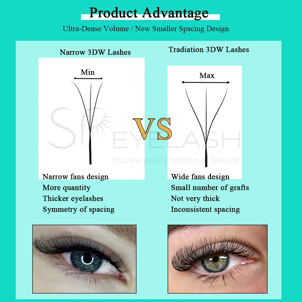 In vergelijking met traditionele brede W-vormige wimpers, nemen de smalle 3DW-wimpers een meer compacte arrangement en uitgebreid wimperbandontwerp aan. De wimpersopstelling met een hogere dichtheid creëert een diepere, vollere wimperlijn, en de smallere fanvorm resulteert in een netter, meer gelijkmatig uiterlijk. Ondertussen vormt de kleinere fanbase in combinatie met de uitgebreide wimperband een groter bindingsgebied, het verbeteren van de hechting en duurzaamheid en het vermijden van de potentiële rommeligheid en oneffenheden van brede W-vormige wimpers.